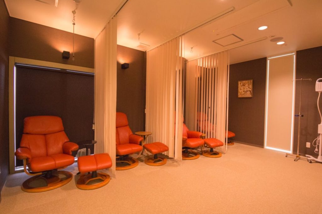 高級車のシートのようなドッシリとしたリクライニングチェアに沈み込むように寝そべって、オルゴールのBGMを聞きながら、一人ずつ区切られた空間でリラックスして待ちます。(緊張が強い場合は、リラックスできる飲み薬を飲むこともできます)